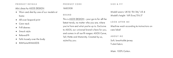 We really like the product description layout on Asos.com – which includes headings to break up sections of information and clean, simple font.